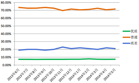 1、截至 2014 年 5 月,統計數據顯示,在百度網頁搜索發現的海量網頁中,優質網頁僅占 7.4%,質差網頁高達 21%,其余普通網頁為 71.6%。